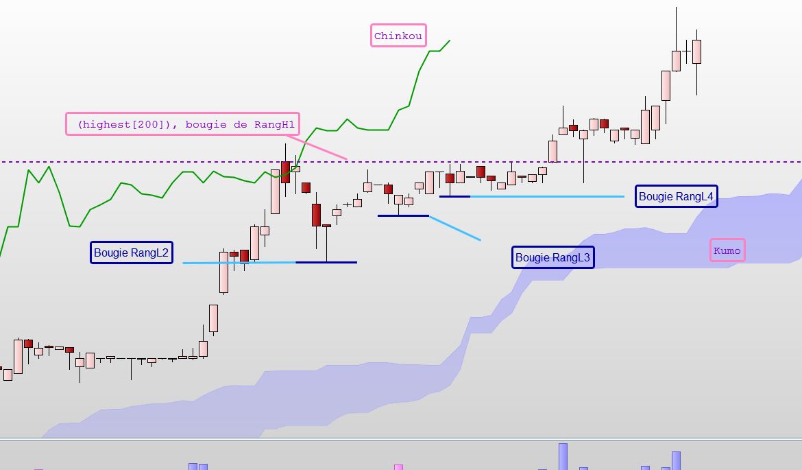 Sauf que celui intitulé “RangH et RangL” calcule apparemment par boucle itérative correctement ces index. Mais il comporte un gros inconvénient : il est très long à s’exécuter (à cause des boucles donc) déjà comme indicateur et puis incorporé à un screener et ce d’autant plus qu’il doit être complété par la détermination d’un certain nombre d’autres index de bougies.