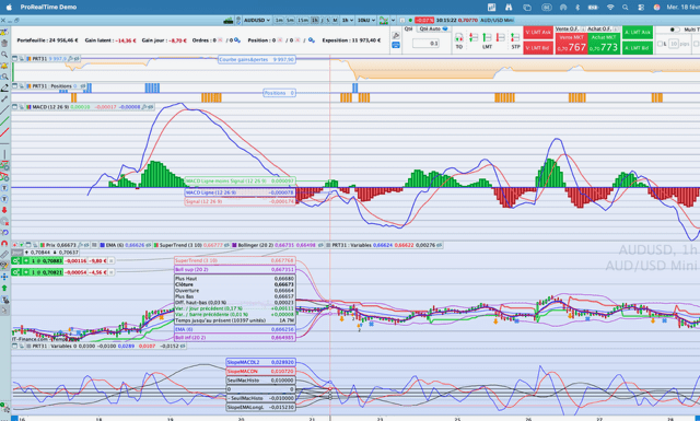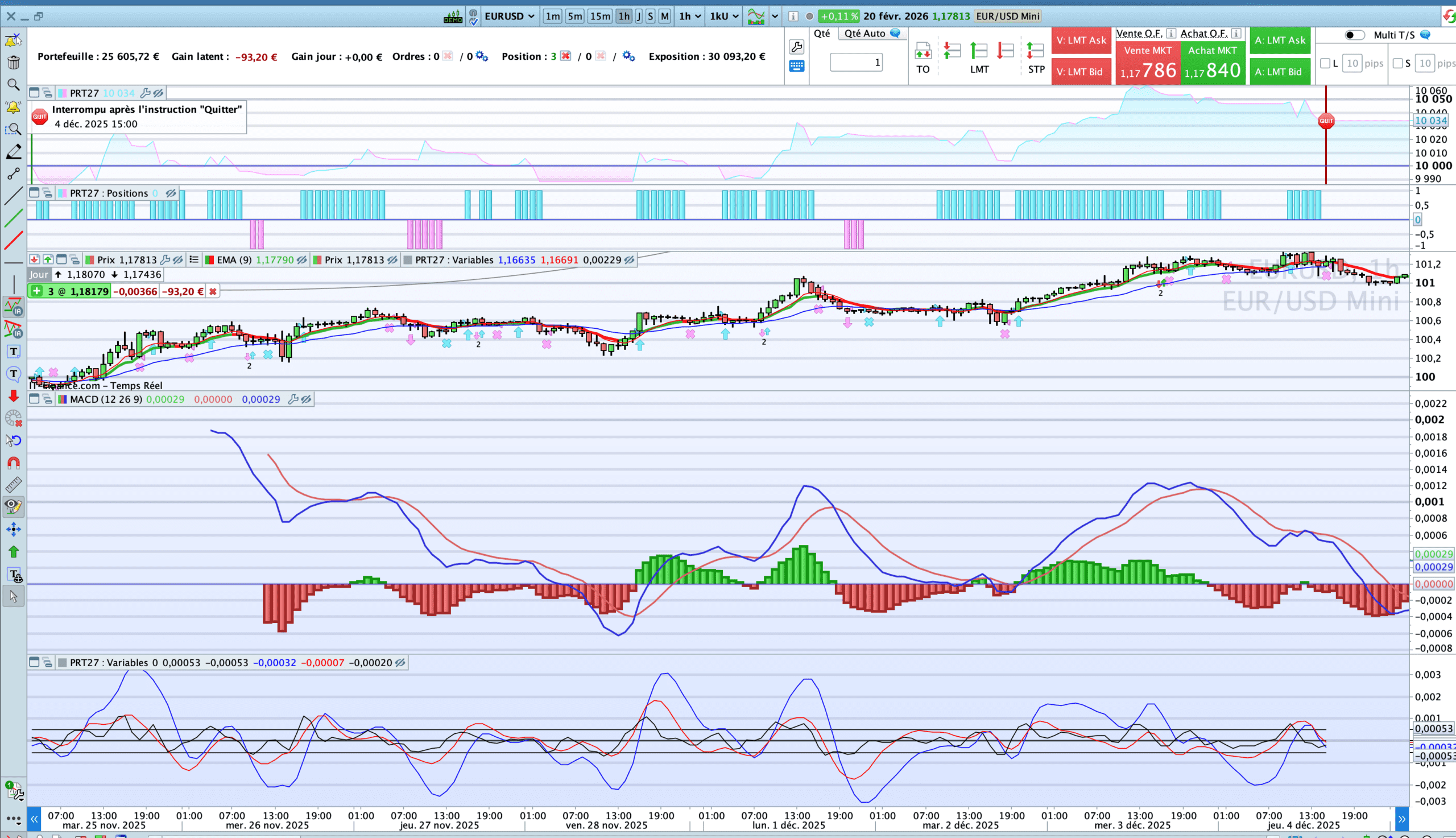 Sur cette image d’écran on voit bien que l’affichage du MACD débute tardivement alors que 10.000 unités ont été préchargées et que des graphiques secondaires (en bas) sont calculés dès le début du code et que des positions sont d’ailleurs prises sur base de ces calculs, basés sur le MACD et utilisés par le code pour prendre position.