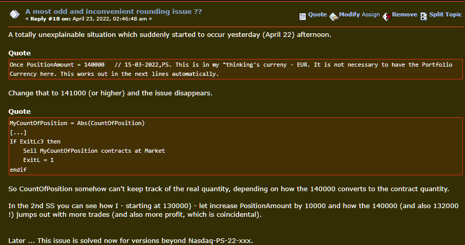 PS: For me it was relatively easy to track down because not long before I started to use CountOfPosition to more easily exit all (after adding position underway), but otherwise … see that descriptive post and it is exactly the same as with you … it depends totally on the values itself whether it would misbehave or not and you’d have no clue …