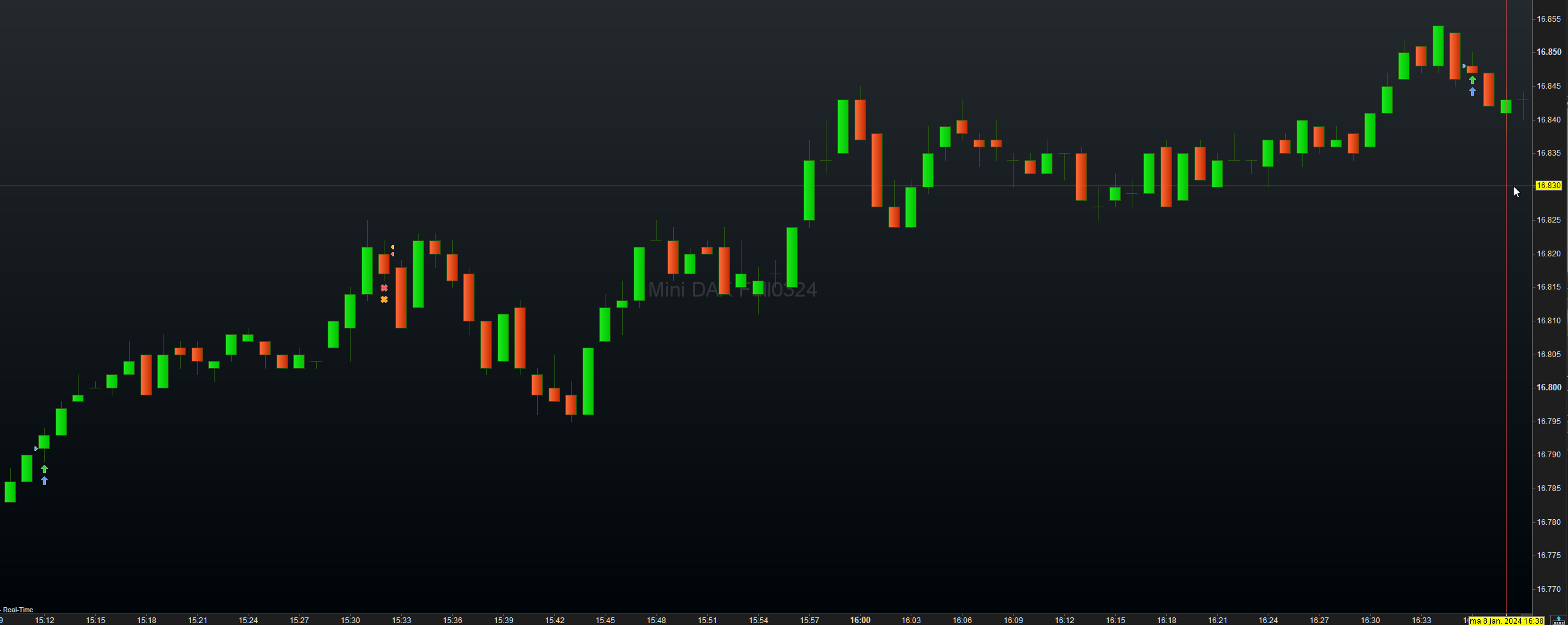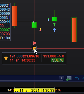 Shown is a small part of Jan 11 (2024). I could show all the trades in 6 or so of these screenshots, but hopefully this is sufficient. There is no trade different to be seen from of Jan 8 (the content of the chart) up till today. You will trust me on that 🙂 …