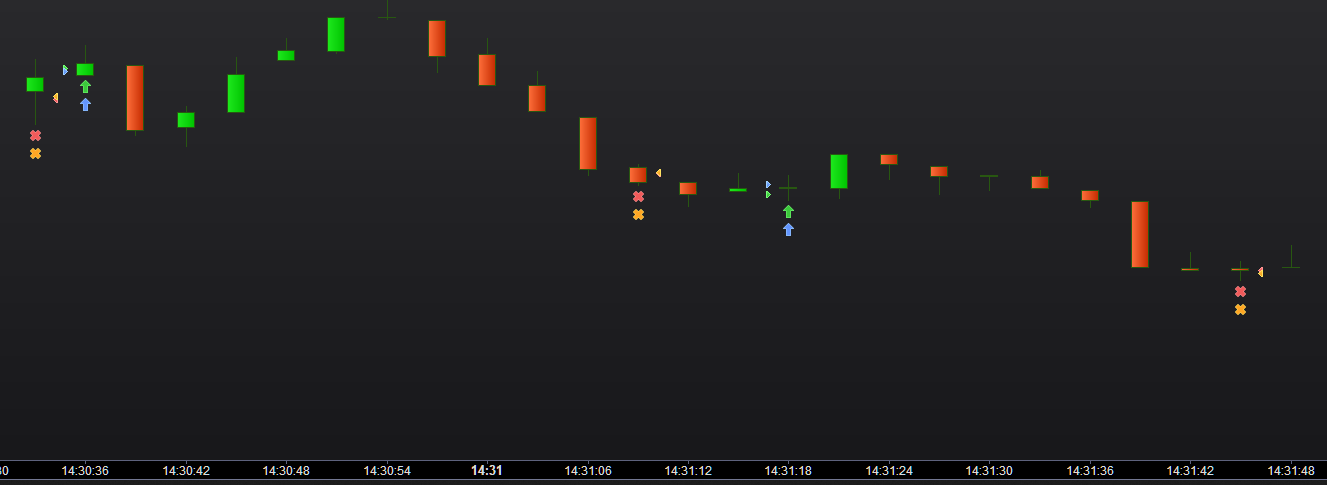 You can see the triangles as well and all are accurate up to in-bar. You can see that Limit and Stop orders are used and that (thus) the triangles are not at the opening (or close) of bars.