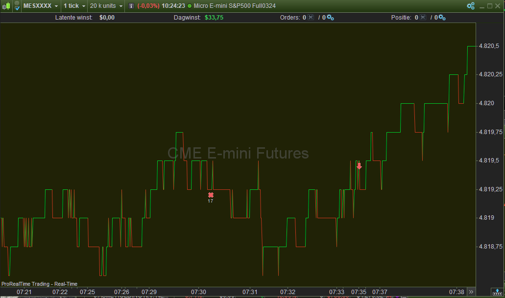 First pic shows a tick chart of an Exit of a trade which comprises 9 contracts of MES (Micro S&P 500). This is (thus) IB. But we see 17 occurrences ??