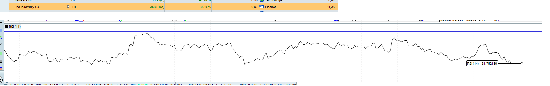 J’utilise le RSI 14 sur close et la différence le 11/06/2024 à 8h du matin est bien présente : sur $ERIE, mon screener indique un RSI de 31,35 (seulement 2 chiffres après la virgule???) et l’indicateur RSI montre une valeur de 31,762180. Dans les 2 cas, il s’agit du RSI de la veille. Ce qui est intéressant à noter aussi est que le prix de clôture sue le graphe est est de 358,61 alors que le screener retourne un close de 358,54.