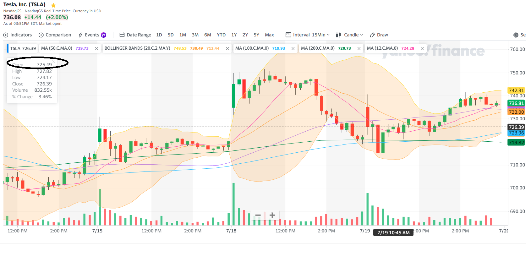 Il prezzo di open di tesla delle 16:45 è 725,49, il prezzo di chiusura della barra a 15 minuti è 726,39