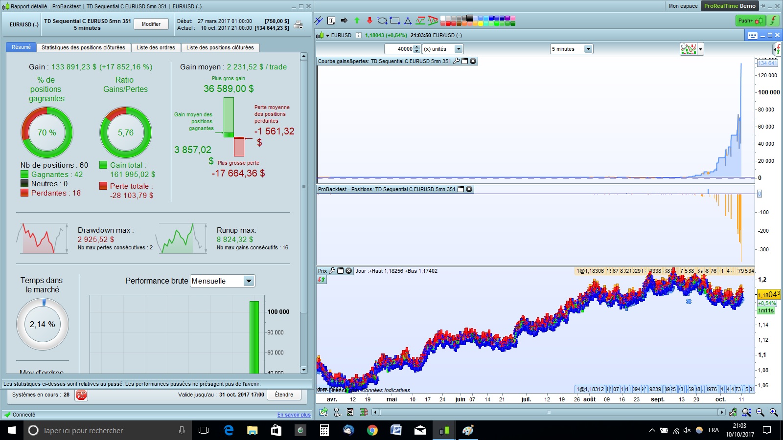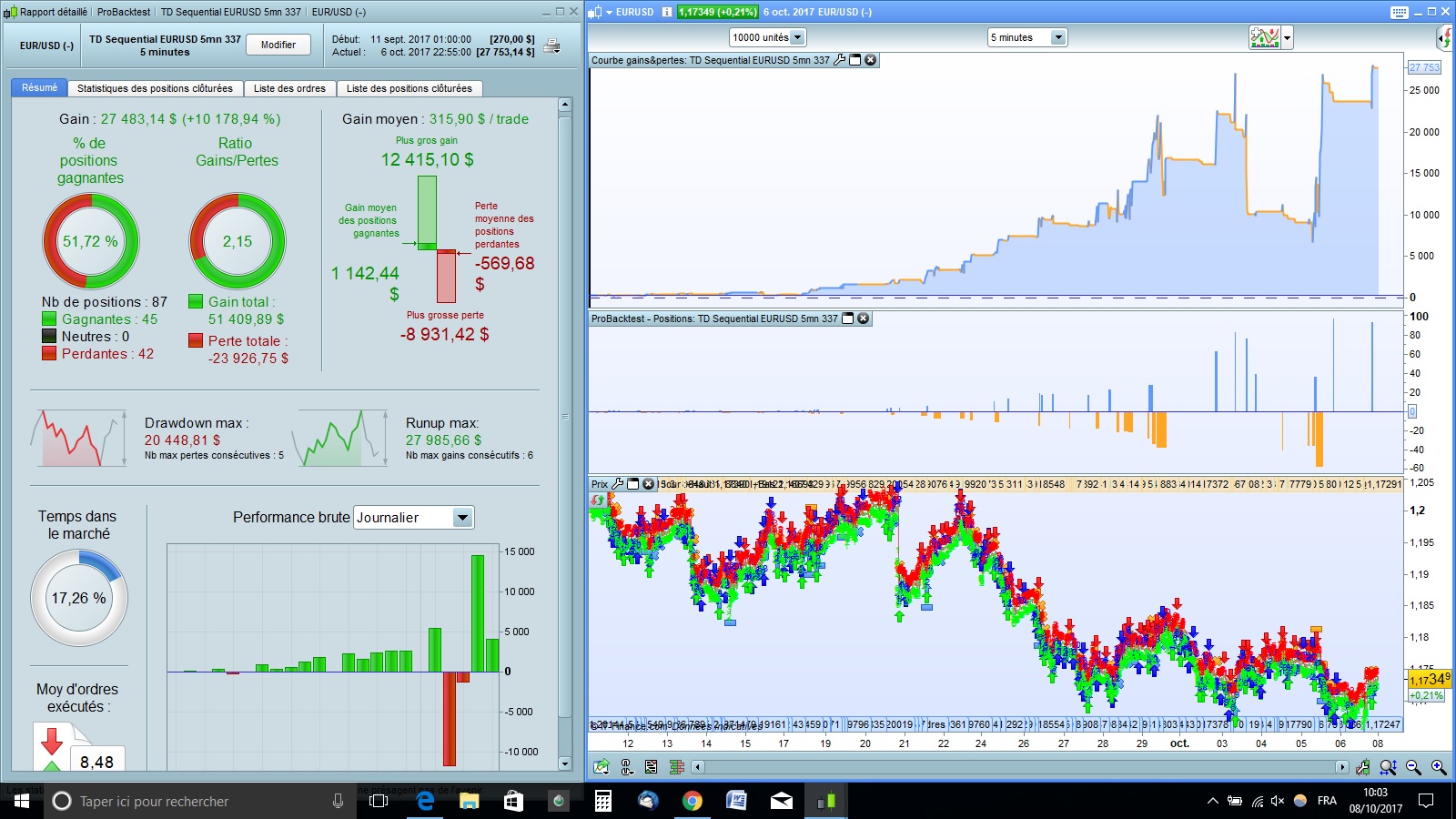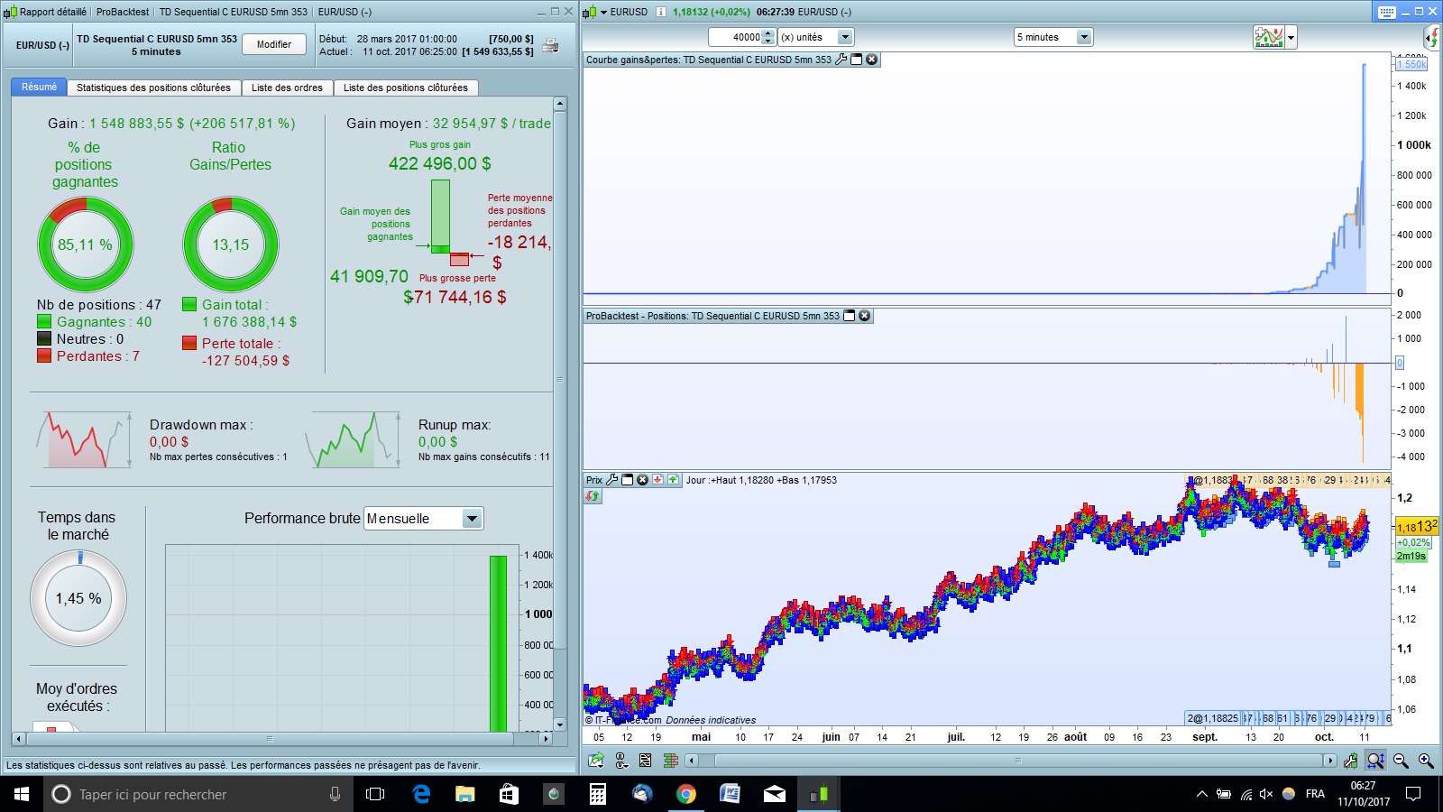quand à la stratégie, j’ai laissé le DAX qui a une faible robustesse quand on effectue l’analyse “Walk Forward” et je me suis orienté vers l’Eurusd.