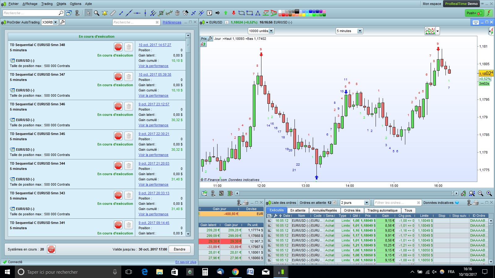 je suis assez satisfait des résultats obtenus (ci-joint une photo prise il y a 1h sur les prises de position sur l’EURUSD à droite, et Pro-order à gauche avec les derniers robots que j’ai installé)