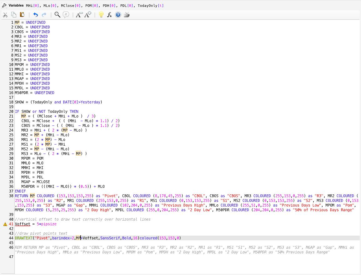 I was after the code that allows you to add a line name option to various lines that are produced by an indicator, very similar to the “Pivot Points” indicator, which allows you to toggle on/off the line name of the various pivots i.e. R1, R2,R3 etc etc. Unfortunately I haven’t been able to access the code for that particular indicator.