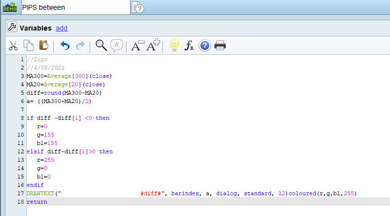 As the title says… anyone knows how to calculate and display in the chart the distance in pips between two simple moving averages? i.e. SMA 300 and SMA 20.