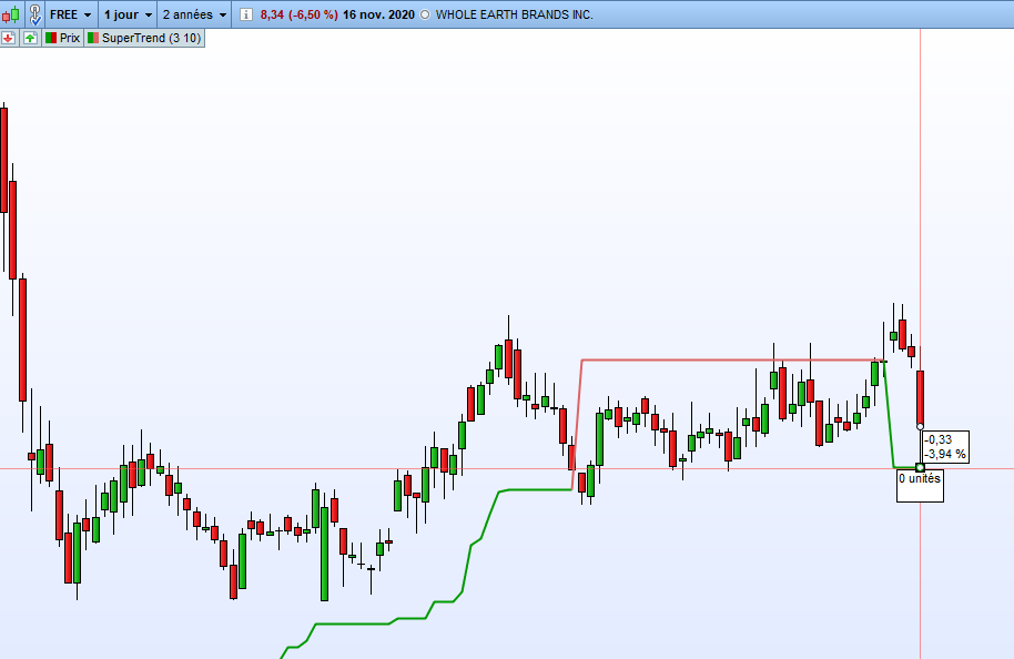 Exemple action Whole Earth Brands “FREE” en Daily, on y ajoute le supertrend.