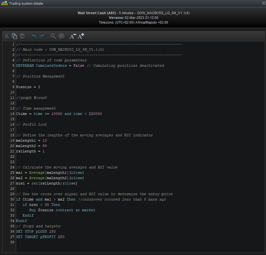 2.) The second strategy is also a MA cross over without the bar count but only the RSI condition (Trying to eliminate some code to try and figure out why I get the error).