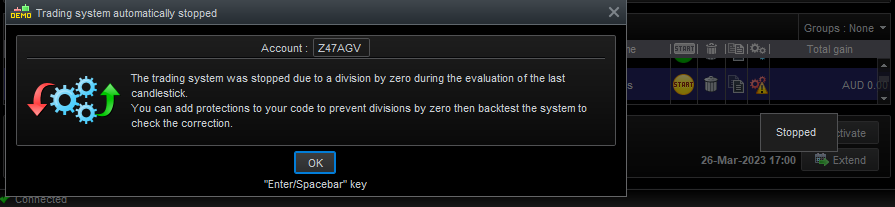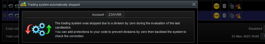 Also notice that one of the strategies actually opened a trade and when the division by zero error appeared it closed the position prematurely (please see image attachments). Thank you.