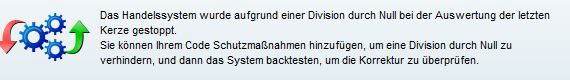 Bei meinen Handelssysten bekomme ich einmal am Tag (ca 7:00 Uhr) den Hinweis es gestppt wurde, wegen einer Divison durch Null.