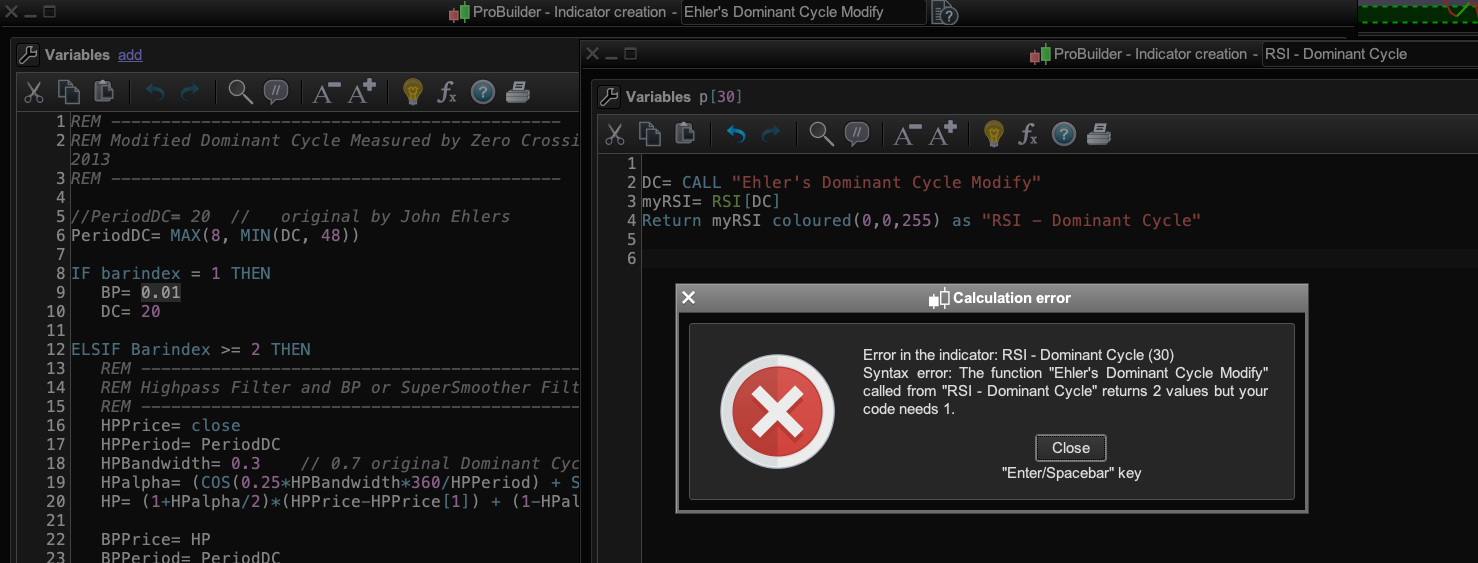 I unfortunately got the same waring back: Pls see image #1. All I did was add back the Return BP code in the DC indicator the other day and then when I launched the charts today the warning came back and PRT would not load the RSI indicator? The RSI only works if I take out the BP line on your DC indicator? Do you know what code is needed within the RSI indicator so I don’t have to keep deleting the BP Return code in your indicator? Thanks.