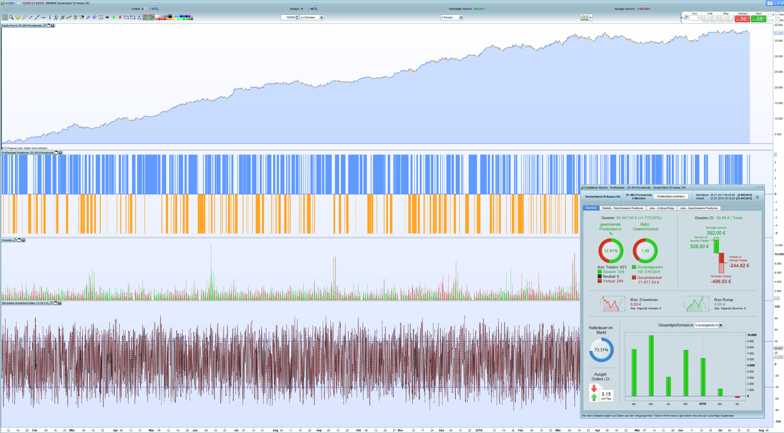 This is an optimized Donchian Volume Breakout System for the DAX M5 with SMA, Volume, ATR, ADXR, CCI which brings around 1.700 % in 16 months with a 5 Lot in 1 € DAX.