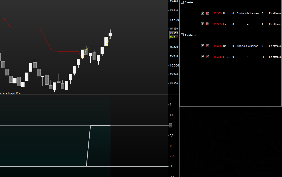 L’idée de fond autour de ma demande consiste à déterminer un sens haussier si, suite à un “Crosses over” DnU[0] >=DnU[1] ou baissier suite à un “Crosses under” DnU[0] <=DnU[1] et d’y greffer d’autres conditions pour déterminer une entrée en position !