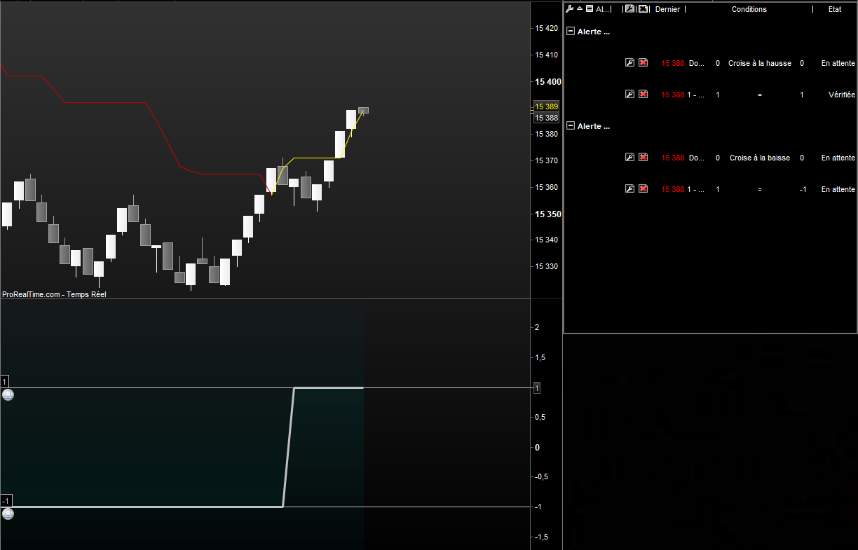 Graphiquement le code que tu m’as proposé s’affiche correctement soit en +1 soit en -1 comme dans les images ci-jointes. Cependant on constatera que sur la fenêtre des “Alertes”(image de droite) la condition +1 n’est pas “Vérifiée” si DnU[0] = DnU[1] et ce alors même que l’indicateur “= +1”, mais elle le devient par la suite si DnU[0]>DnU[1] !!!(illustration image 1 et 2)