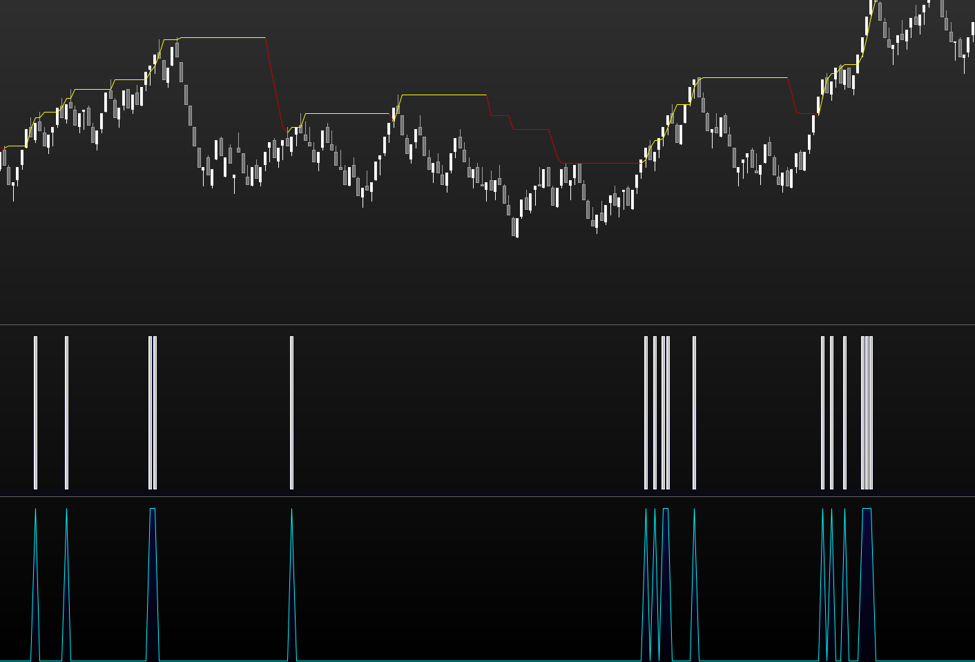 Suite à un crosses over sur le “DonchianChannelUp” je souhaiterais faire perdurer le signal +1 comme dans le code ci-joint dans une fenêtre sous le prix. Et ce dans l’idée de pouvoir imbriquer d’autres conditions tant que “DonchianChannelUp” = +1