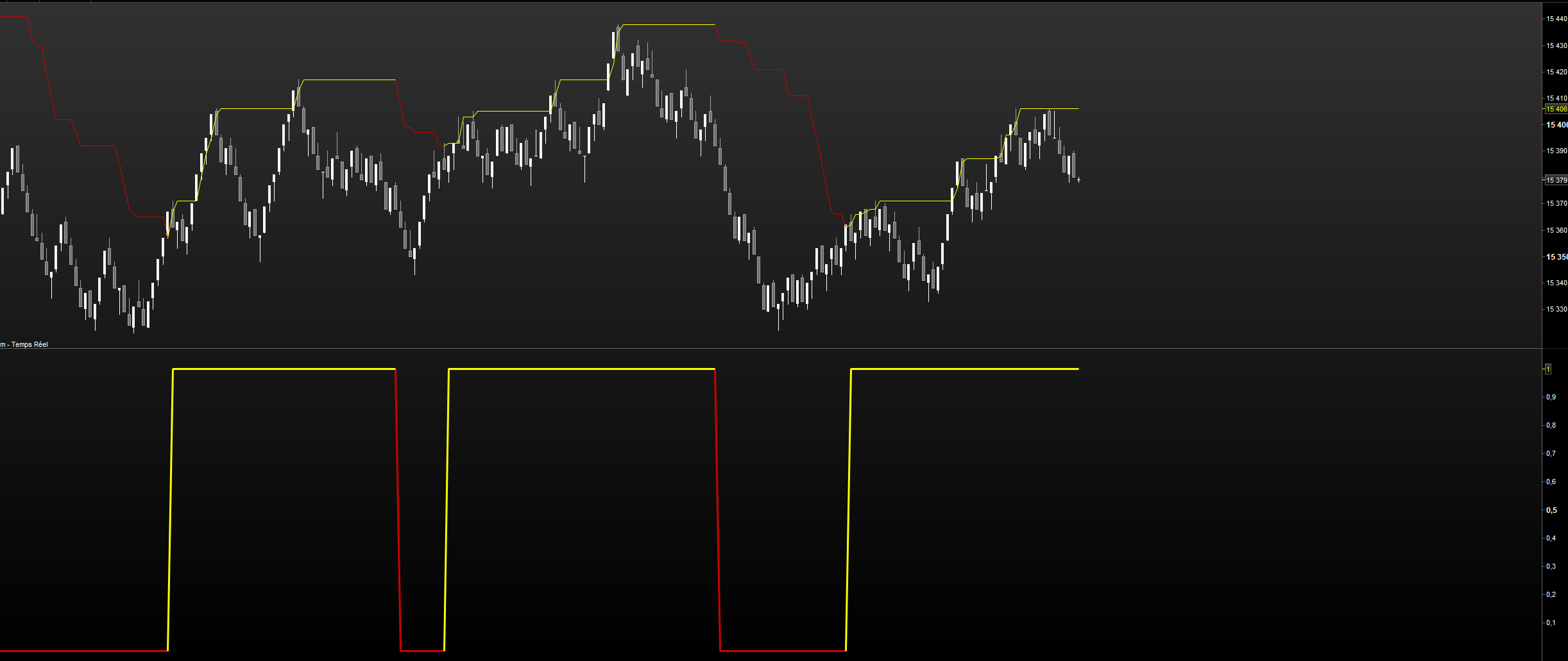Le code que j’ai proposé est plutôt simple. Dés la première occurrence d’une montée du donchian, l’indicateur passe à 1, dés qu’il descend il repasse à 0. Sinon il ne se passe rien, il continue à tracer la dernière valeur affectée.