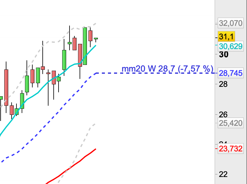 J’affiche d’abord mon graphique en hebdo, puis je trace manuellement avec les outils de dessin une ligne pointillée correspondante à la dernière valeur de la mm20 hebdo (graphe de gauche)