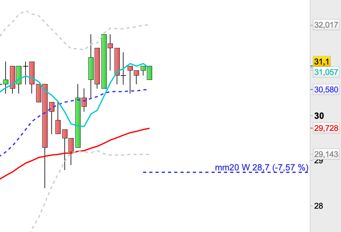 Puis je bascule en vue journalière et j’ai toujours à l’écran la ligne pointillée correspondant à la dernière mm20 hebdo (graphe de droite)