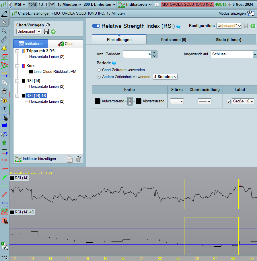 der 1. RSI soll in den Standarteinstellungen von 15 min bleiben, bei dem 2. RSI jedoch soll der Timeframe auf 4 Stunden umgestellt werden.