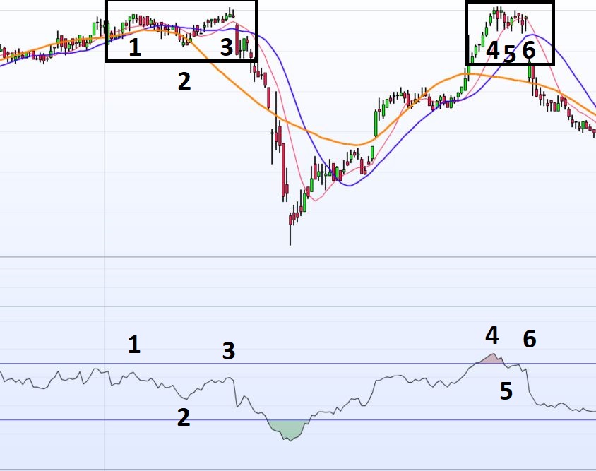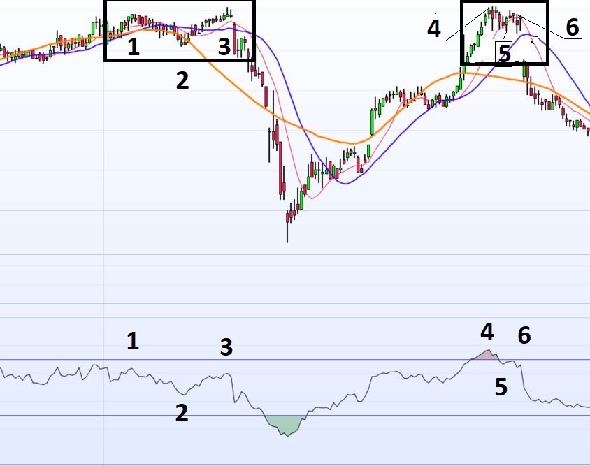 L’unica cosa che, però, li accomuna, è l’andamento dell’RSI a 20 periodi che, in corrispondenza di entrambi i primi massimi (1 e 4) raggiunge un punto massimo, in corrispondenza di entrambi i minimi (2 e 5) raggiunge un punto minimo e, in corrispondenza dei due secondi massimi (3 e 6) raggiunge un nuovo massimo (superiore a 2 e 5) inferiore però al massimo precedente (1 e 4).