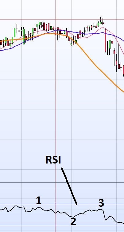 - un valore massimo X (corrispondente ad es al punto 1 del file Doppio massimo.JPG, per chiarire), un valore inferiore X-Y (punto 2) ed un nuovo massimo minore di X ma maggiore di X-Y (punto 3) (esempio di andamento RSI in caso di DOPPIO MASSIMO). UNA VOLTA RAGGIUNTO TALE PUNTO 3, IL VALORE DELL’RSI DEVE RIMANERE COMPRESO TRA I VALORI DEI PUNTI 1 E 2.