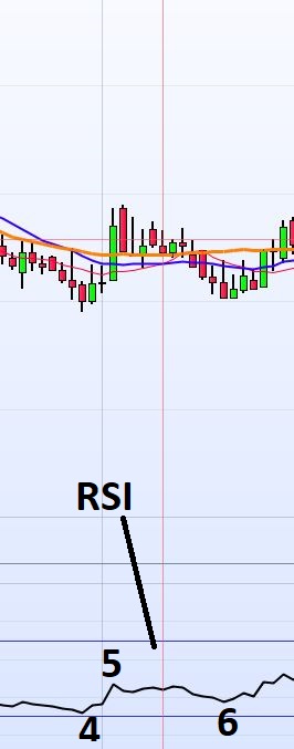 un valore minimo 4 (vd. file Doppio minimo.JPG, per chiarire), un valore superiore 5 ed un nuovo minimo maggiore di 4 ma minore di 5 (punto 6) (esempio di andamento RSI in caso di DOPPIO MINIMO). UNA VOLTA RAGGIUNTO TALE PUNTO 6, IL VALORE DELL’RSI DEVE RIMANERE COMPRESO TRA I VALORI DEI PUNTI 4 E 5.