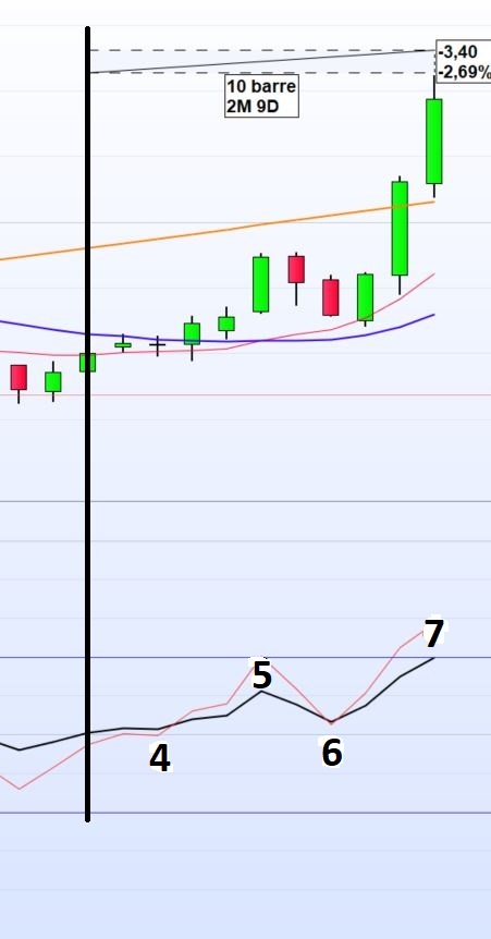 - un valore minimo X (corrispondente ad es al punto 4 del file Doppio minimo.JPG, per chiarire), un valore superiore X+Y (punto 5) ed un nuovo minimo maggiore di X ma minore di X+Y (punto 6) (esempio di andamento RSI in caso di DOPPIO MINIMO). UNA VOLTA RAGGIUNTO TALE PUNTO 6, IL VALORE DELL’RSI DEVE RIMANERE COMPRESO TRA I VALORI DEI PUNTI 4 E 5.