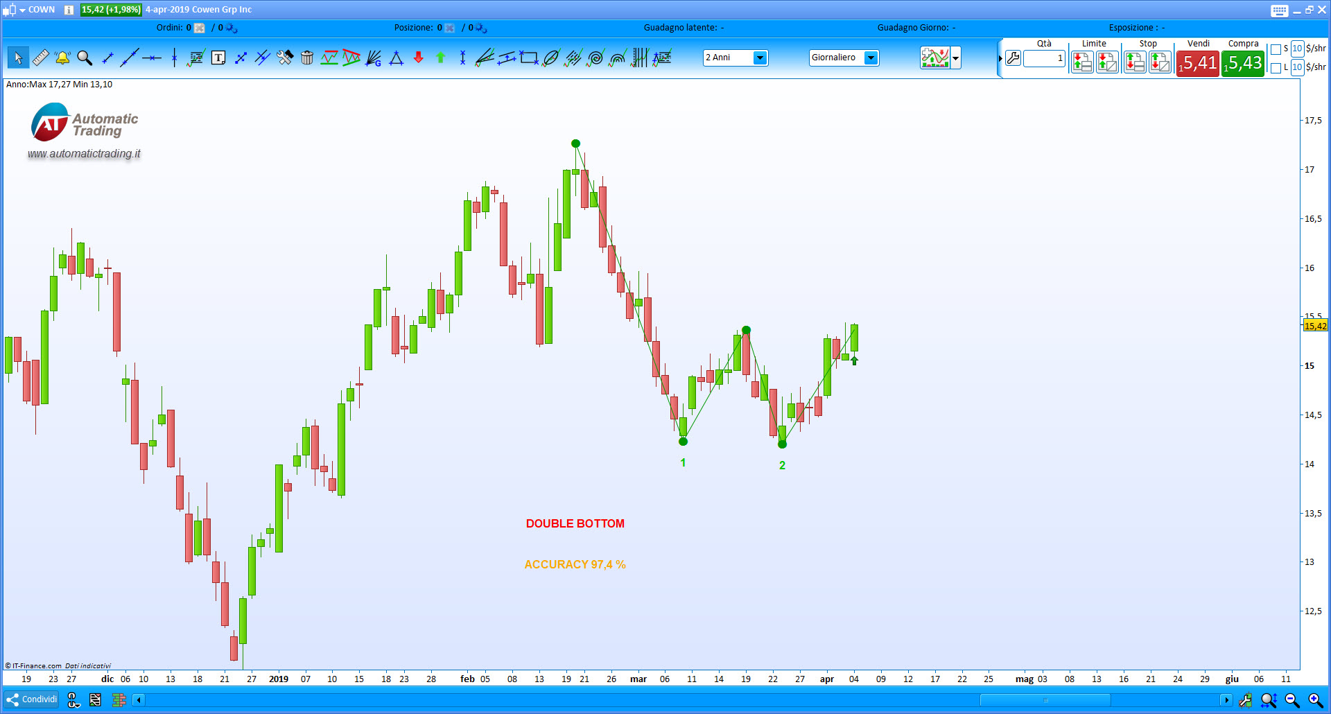 Automatically identifies the double top and the double bottom patterns, it’s compatible with all instruments, it’s compatible with all ordinary timeframes and even on tick-charts!. It’s compatible with Heikin ashi, Renko, Ticks, Kagi, Three Line Break, and more. Patterns are completely customizable to suit your own trading style. The indicator can be integrated into any automated trading strategy, using ProRealTime’s ProBuilder function, and there’s its scanner, that scan the patterns in realtime, on any market and for any compatible timeframe