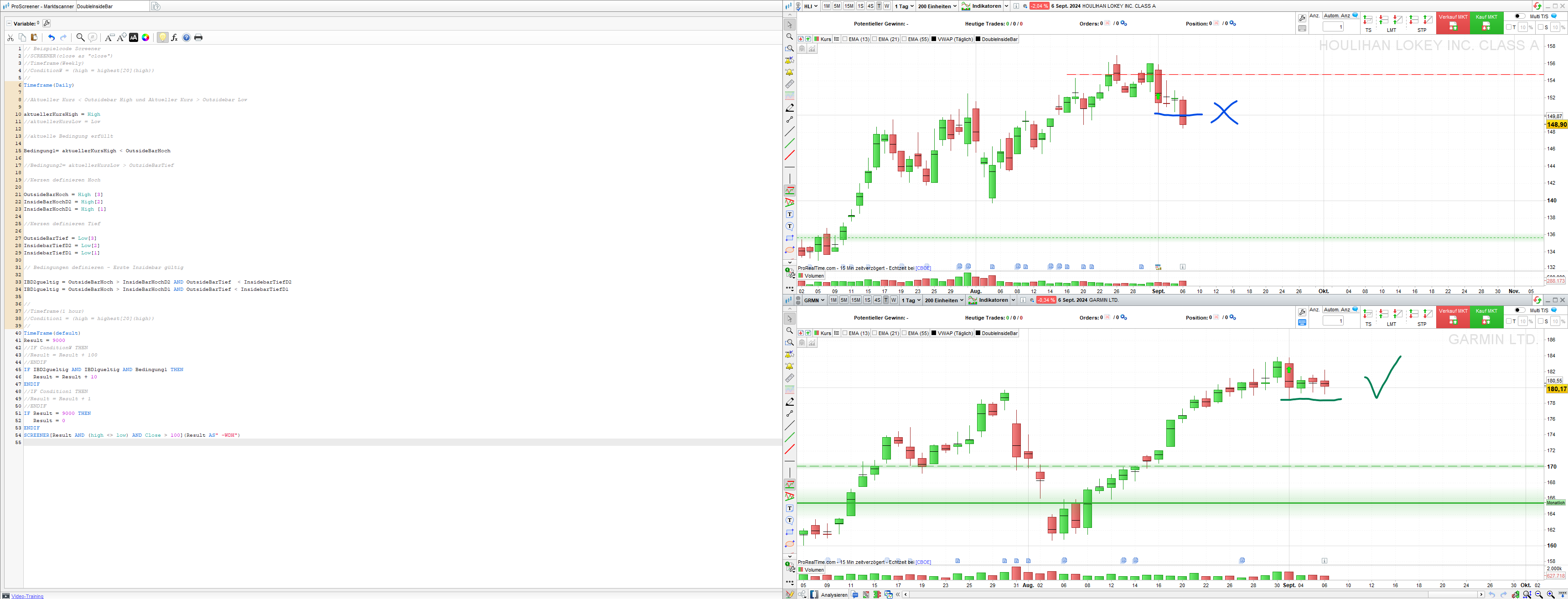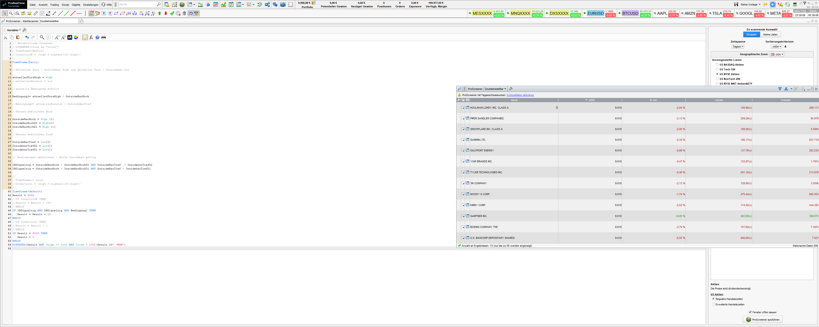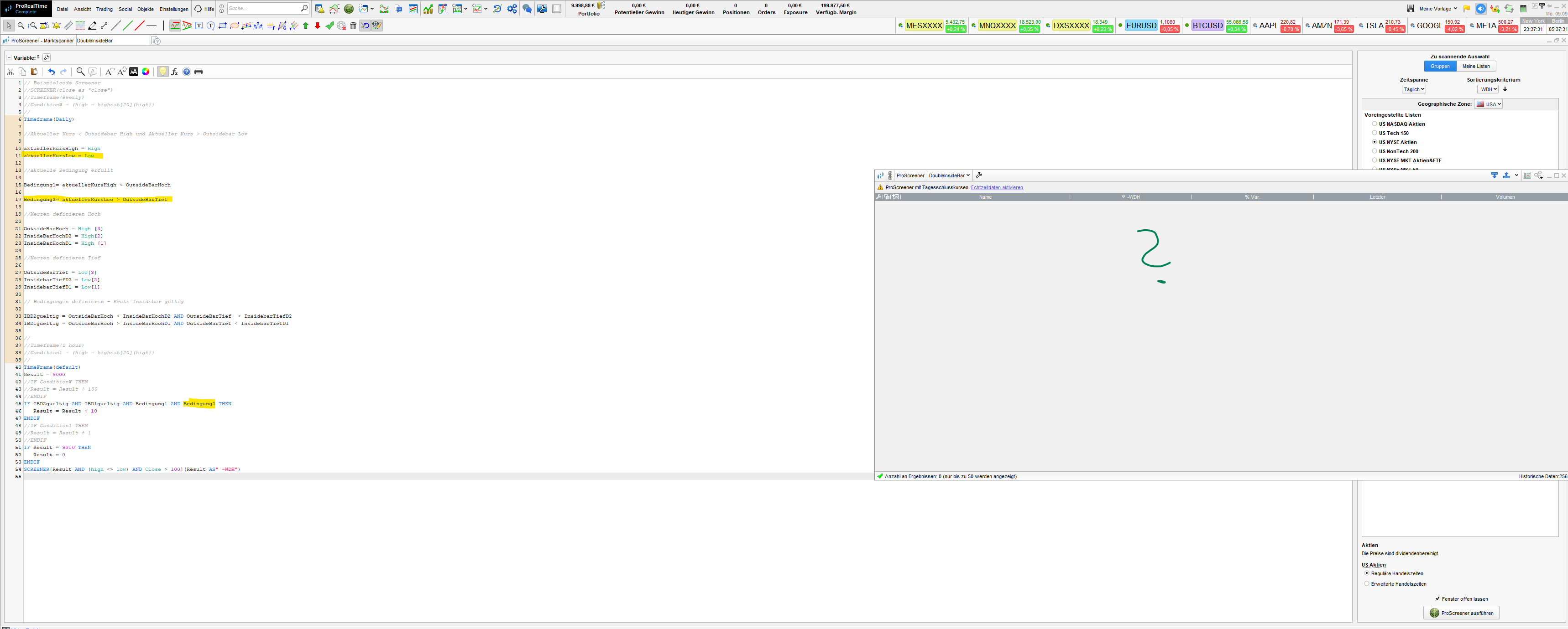 Jetzt habe ich den Screener soweit fertig und ich bekomme Aktien angezeigt, die dem Double Inside Bar entsprechen. Ich möchte jetzt allerdings lediglich Aktuen angezeigt bekommen, bei denen die Out Side Bar noch nicht von der aktuellen über- bzw. unterschritten wurde.