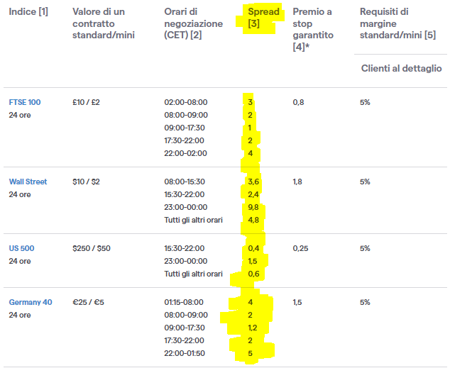 Ti allego un’immagine dove verificare i valori, strumento per strumento, sulla piattaforma di trading manuale di IG (ma puoi trovarle ancghe sul loro sito, credo).