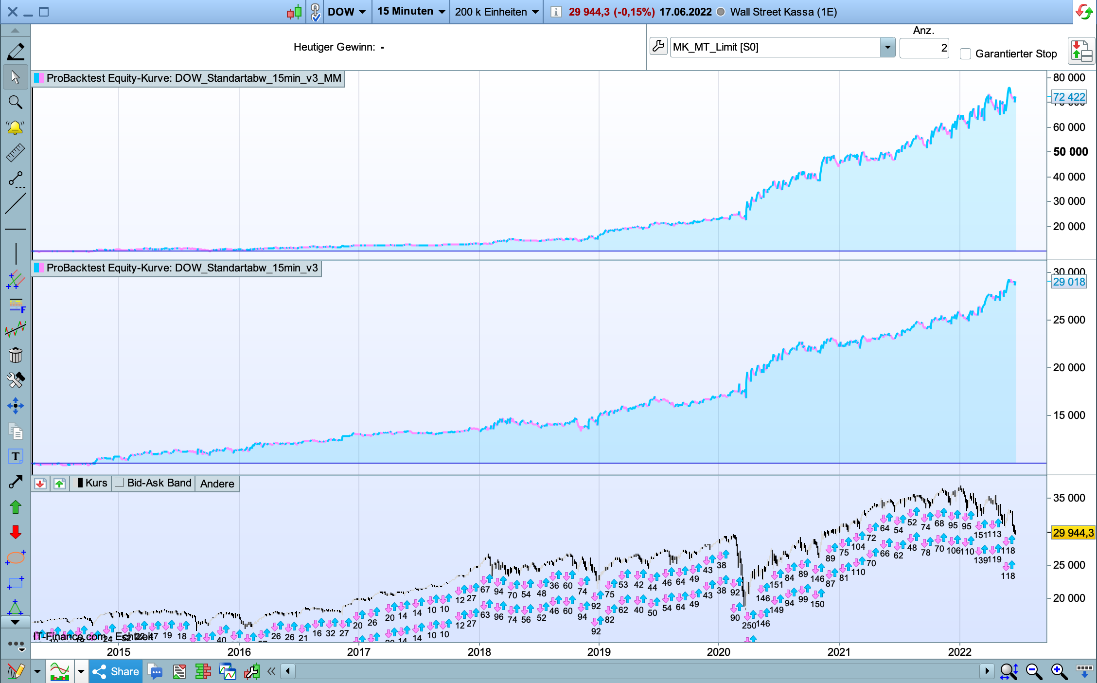 Hi, want to share a Simple Strategy. With a very simple Buy- and Exitcondition. Its just a Long strategy on a 15min timeframe (Tickbased, Spread:1). It also works with other settings on a 1h timeframe. I come to this Strtegy by playing around with a Web based Expertadvisor-Generator for MT4/5, and many tests. If someone had an idea to make it a little bit better, it wud be very nice. 🙂