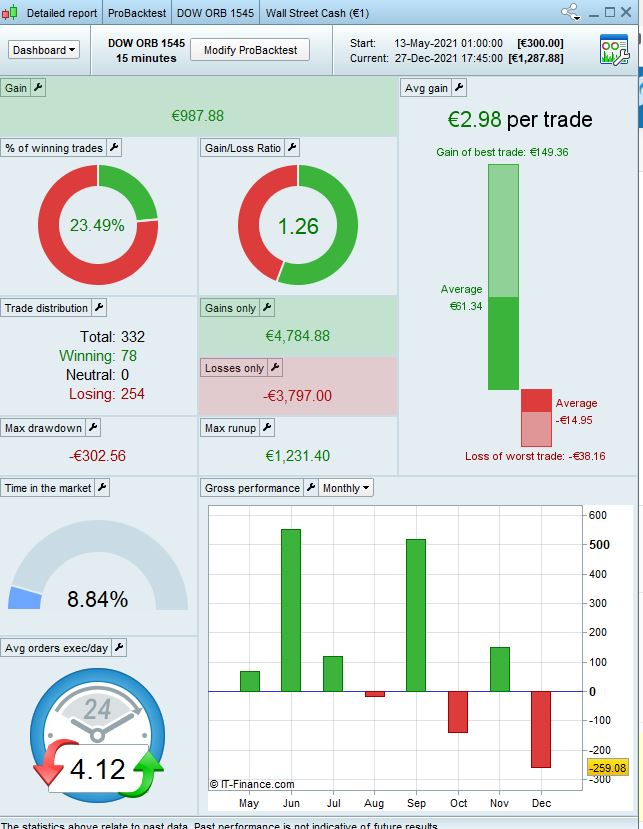 I have adapted a code from this website to suit my needs. The strategy I intend to trade is that I would like to trade the breakout of a range during the first 5 minutes of the Dow Jones session (153500h GMT +1 time). The range is determined by the 15 minutes preceding the session. Stop loss is the range+2 pts and target is the range*5.7. This strategy has given satisfying results when traded manually since September 2020 and automatically until July 2021. I have thus started playing around with the time allowed to open a position by increasing it from 153500 GMT+1 to 154500h and the results look much more stable. However, now I am unsure if the strategy is curve fitted. In PRT I used the maximum amount of data (15k units) in the 15 minute time frame. Walk forward testing shows various efficiency levels.