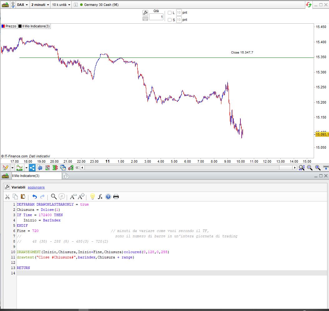 Ho provato, la formula. Per tracciare il close di ieri, va bene questa formula (Dax – 2 minuti)