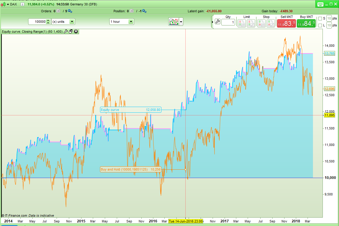 In this example the lookback period is 1400 hours or approx a quarter of a year. The orange line is buy and hold and it can be seen that there are some massive potential drawdowns if you had got into a trade at the wrong time and held on to it or carried on trading through massive market corrections. The strategy itself only does slightly better than buy and hold but it has long periods not in the market (zero risk time) and the drawdown is only around 6% with a starting balance of 10K. The filter does not close any trades, it just stops new ones being opened until price has stabilised or recovered.