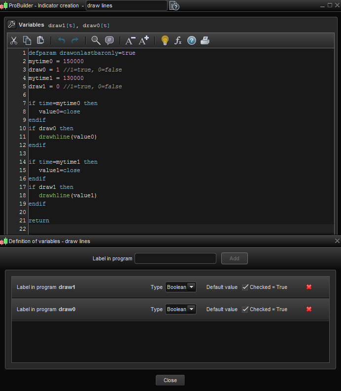 thanks for getting back.. what i meant was.. adding two lines on the chart one at 130000 and one at 150000. and a way to switch those times (add on the variables- like tick or untick) so we can either see two lines on the chart or we can untick to see one?!?! tried below but its a big failure!!