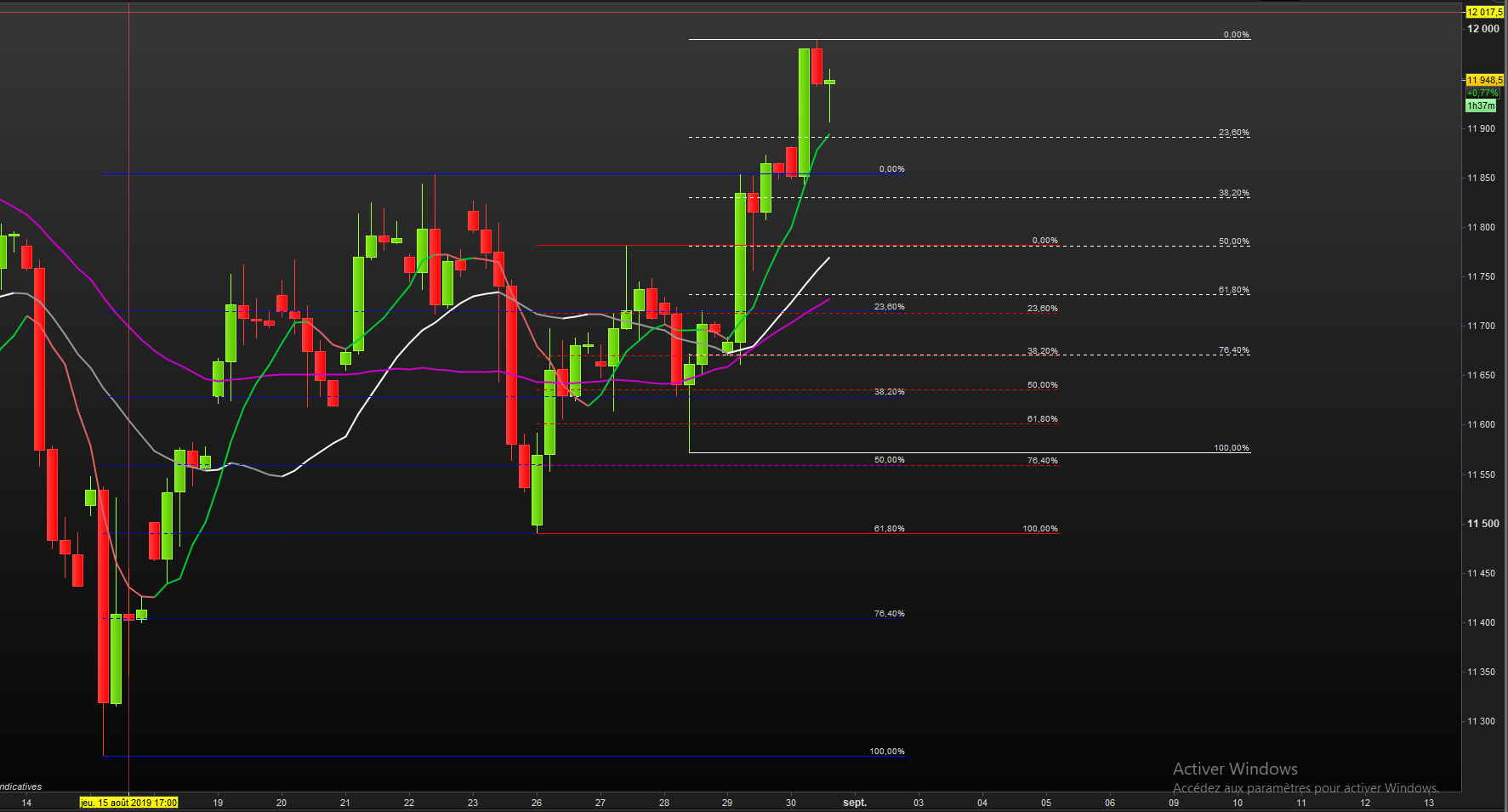So I’m looking for a way to remove this fixed period, by using a rule. The rule is “if there has been a retracement greater than 50%, and then afterwards the market turns again and break the 50% level again, then a new fibo should be drawn”. I have attached an exemple on the Dax TF4H. Three fibos can be drawn successfully, first the blue, then the red, and finally the white. It means that the fibo which is now relevant is the white one, the two other can be deleted. This is in opposition with the common way to drawn it (11265-11990 vs 11572-11990).