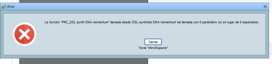 “La función “PRC_DSL synth EMA momentum” llamada desde “Mi screener” es llamada con 6 parametro (s) en lugar de 0 esperados.