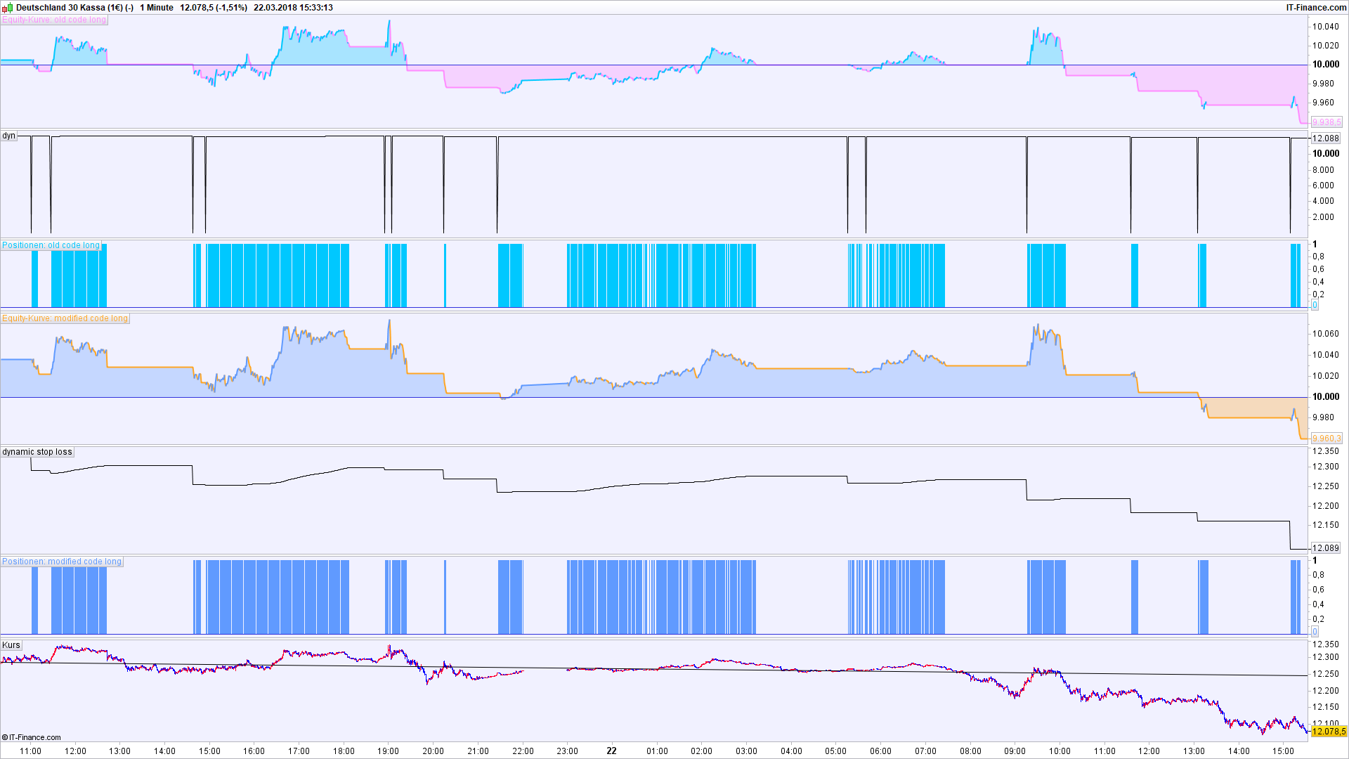This is also the reason why the “GRAPH dynamicSL ” command in the last line of the original code gives a little strange looking results. There are spikes down to almost 0 each time when a new position is opened or when “condition” is true once again during the course of an open position, because then “dynamicSL” switches from an absolute price to a small stop distance and back.