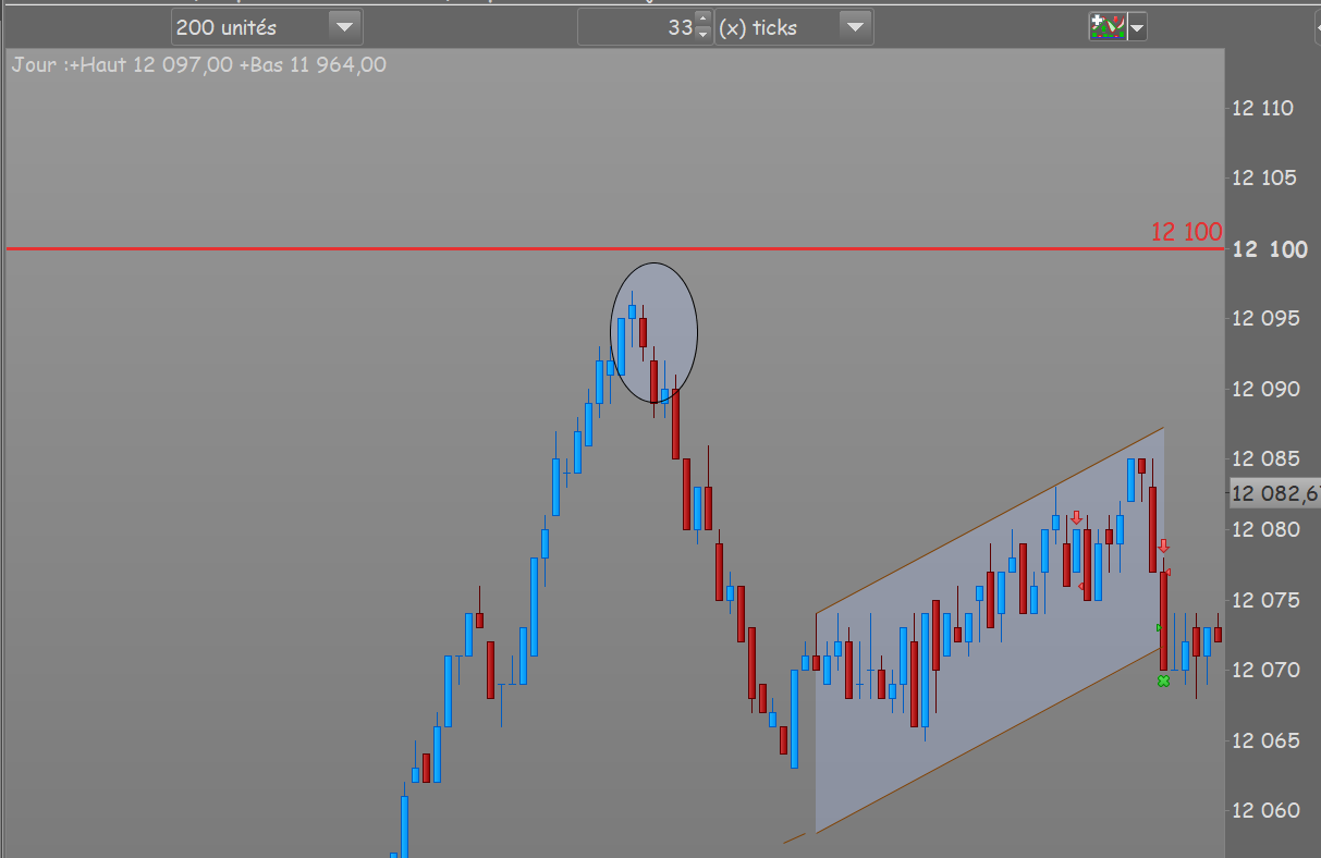 Bonjour, pas sûr de poster au bon endroit auquel cas désolé, je cherche une “EA” qui modifierait l’utilisation du ticket de PRT, pour du scalping sur du tick chart comme sur le graphique ci dessous je décide de rentrer sur le niveau que je choisis et dans cet exemple je décide suite à la dernière bougie haussière de rentrer si avalement de la précédente à la baisse, donc lorsque je cliquerai sur vente pendant la construction de la bougie baissière l’EA devrait déclencher la vente sous plusieurs conditions, 1 que la clotûre de la bougie en cours pendant laquelle j’ai cliquer avale bien la bougie haussière précédente en clôture, 2 que l’ouverture de la nouvelle bougie ne soit pas trop éloignée en pip de la clôture de la bougie avaler avec une option pour choisir cette valeur en pip car en scalping si la bougie ferme trop loin le mouvement est déjà parti, et la dernière option serait de placer le stop loss au dessus dans ce cas pour une vente du précédent plus haut à x pip à déterminer par exemple plus haut + valeur du spread + 1 pip par exemple.