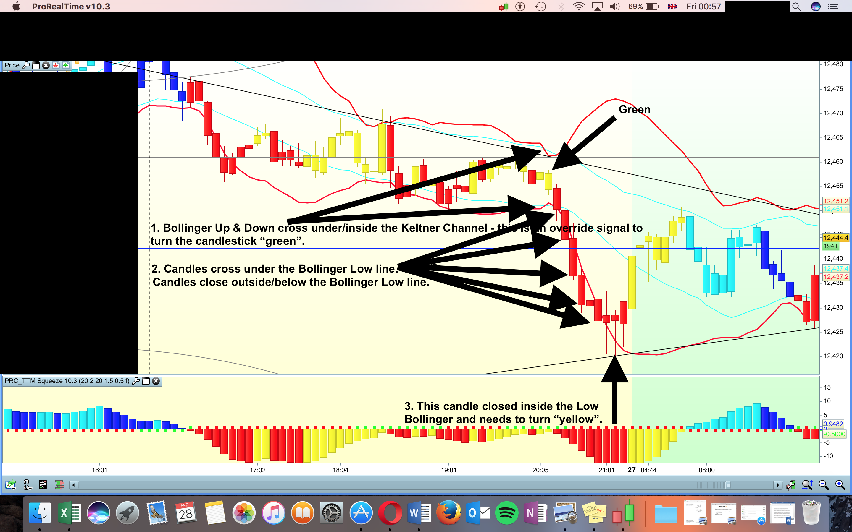 This means that all candles after Condition 2 is met will be “red” till shift in momentum. We are looking for early indication that momentum is about to shift. So long as the candles remain “red” and any time any red candle closes above Indicator 2 then that candle is to turn to “yellow”.