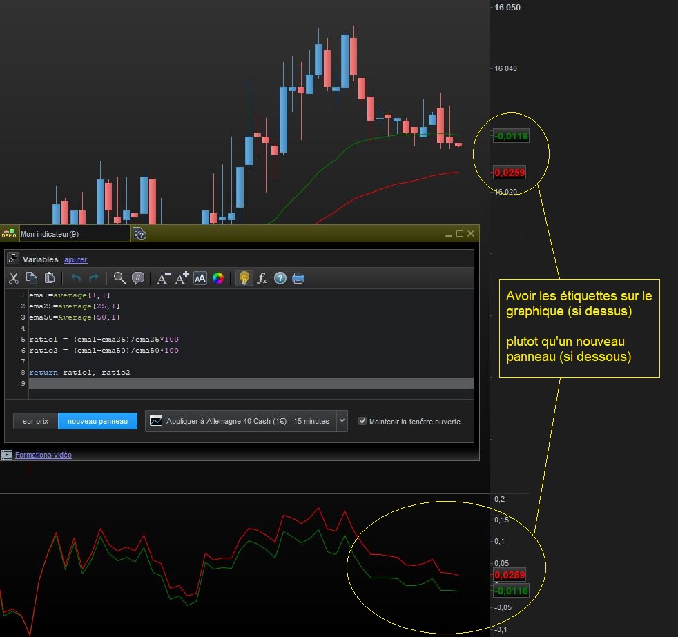 Mais voilà mon problème, j’aurai souhaité avoir les ratios en % en étiquette sur la barre des échelles de prix et non dans un panneau en dessous du graphique (voir première image).