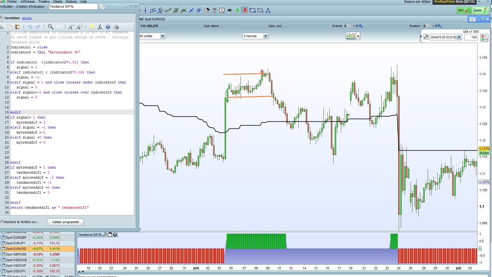 1 – mon indicateur que j’ai appelé ” Tendance Dif1%” se déclenche et
