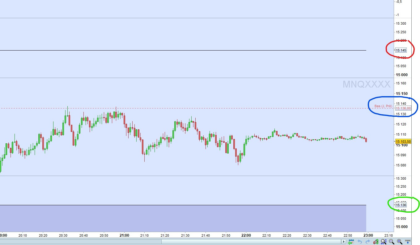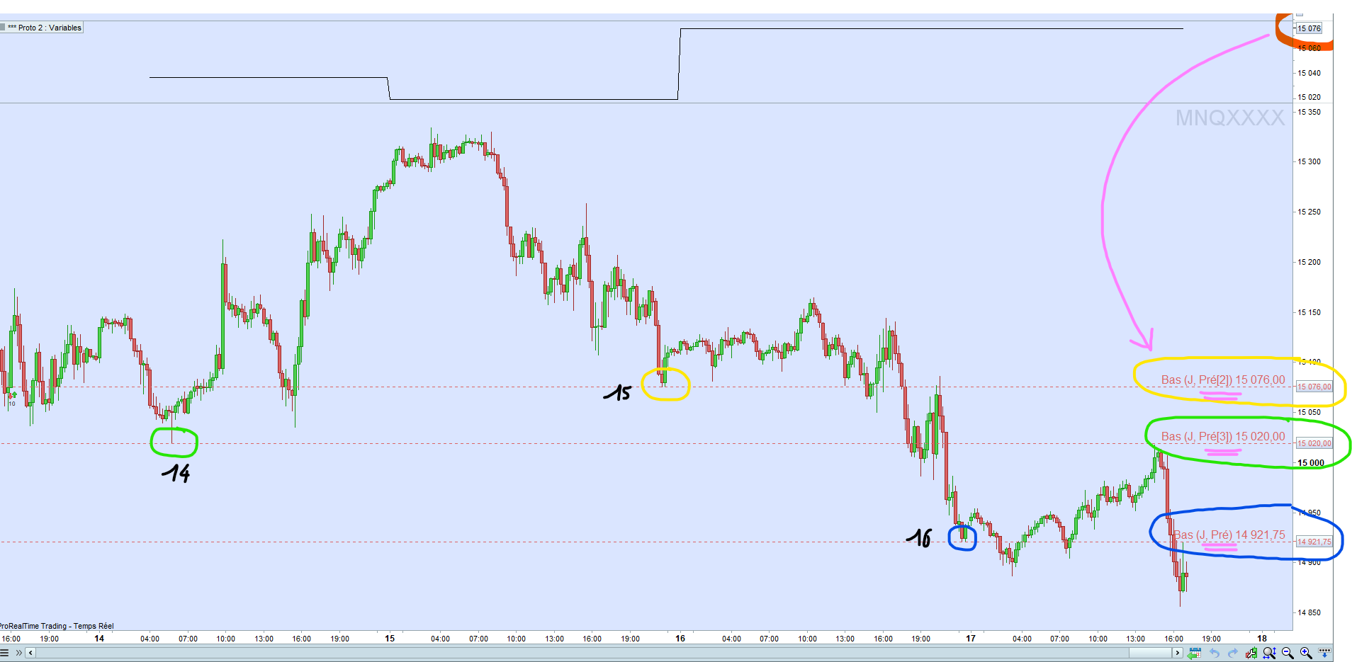 Après de nombreuses tentatives, je n’ai pas réussi à corriger l’écart entre le plus bas jour précédent 15 136 (entouré en bleu) et l’instruction DLow(1) 15 145 dans ProBacktest (entouré en rouge). Et par contre, le DLow dans Indicateurs (entouré en vert) fonctionne bien 15 136.