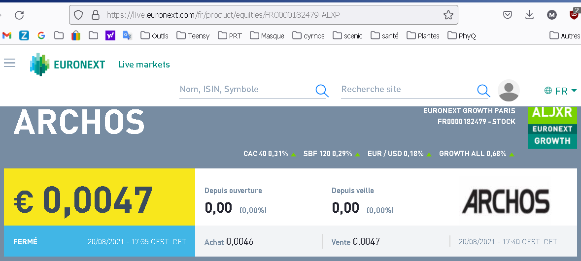 Actuellement Archos est depuis peu de temps, cotée sur le marché dit “Euronext Growth Paris”. Avant c’était ailleurs, j’ai oublié où… Les données que vous avez utilisées viennent probablement de cette époque révolue. Si vous savez le courage de recommencer? avec le mnémonique ALJXR correspondant au code FR0000182479