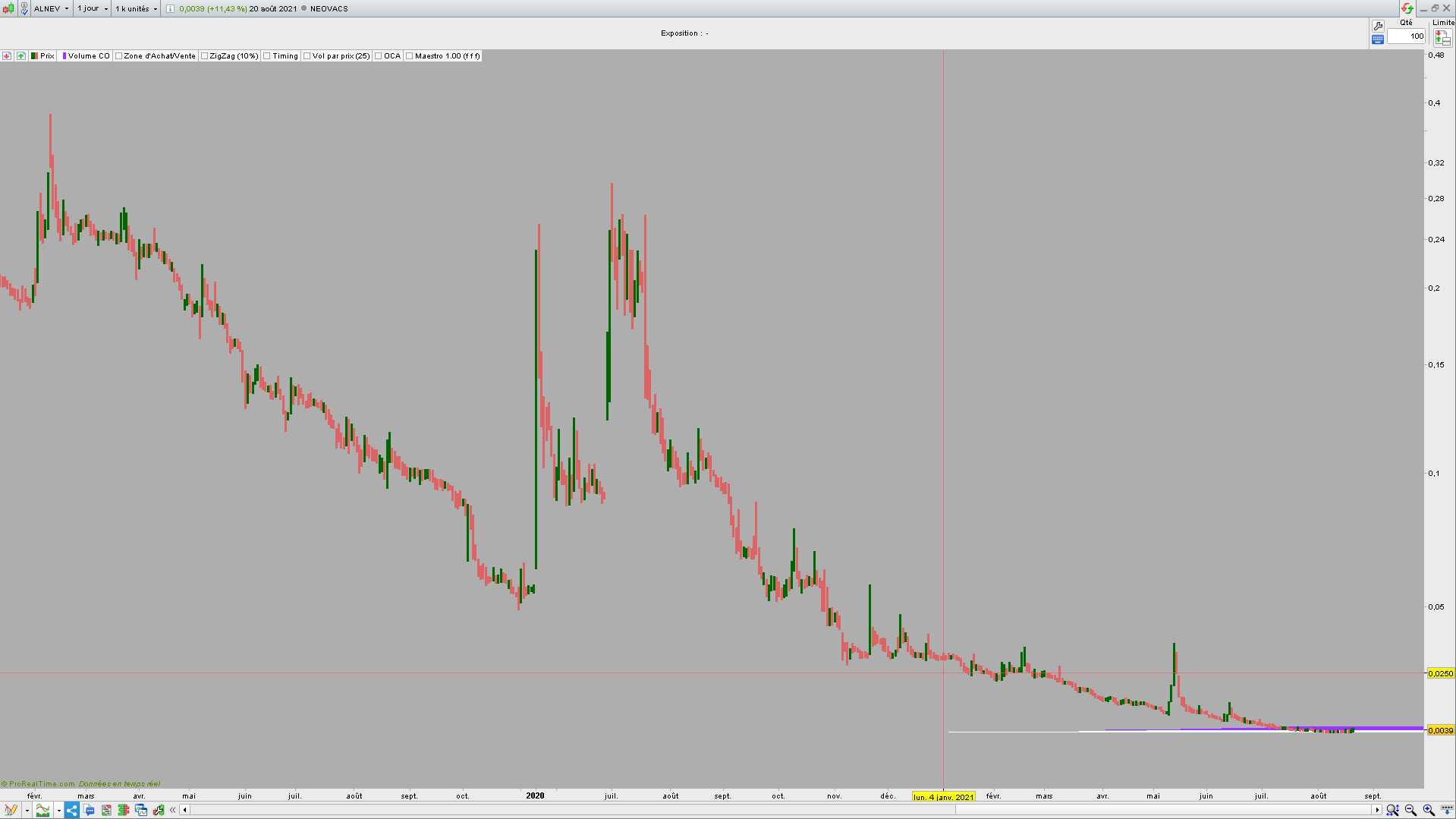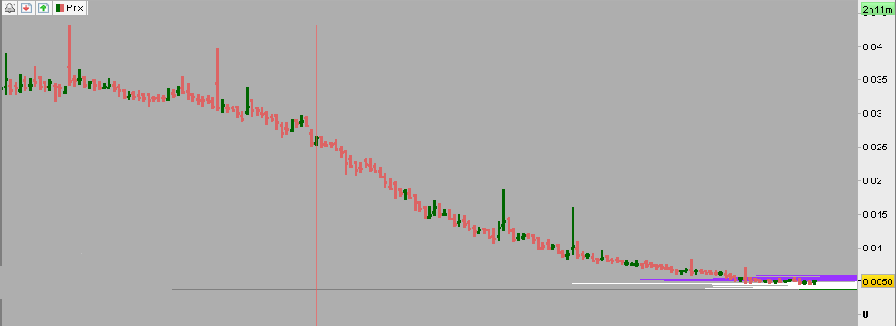 GraHal Si vous ne pouvez pas accéder à ALJXR, essayez avec n’importe quel titre dont le cours a chuté en dessous de 0.05 Euro, c’est le seuil en dessous duquel l’échelle devient linéaire (sur mon PC en tous cas) . Par exemple [Acheter louer ALALO] ou [Néovac ALNEV] , sauf si de manière générale, vous n’avez pas accès à Euronext Growth dont elles dépendent, je n’en trouve pas qui aient chuté aussi bas en dehors de ce marché…