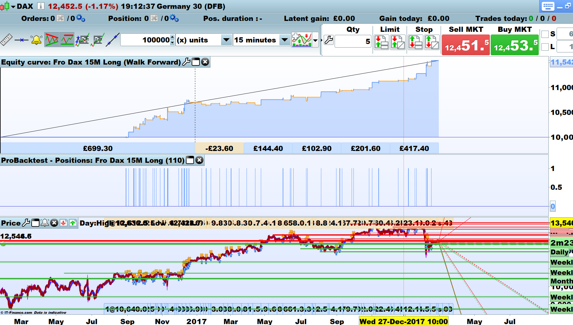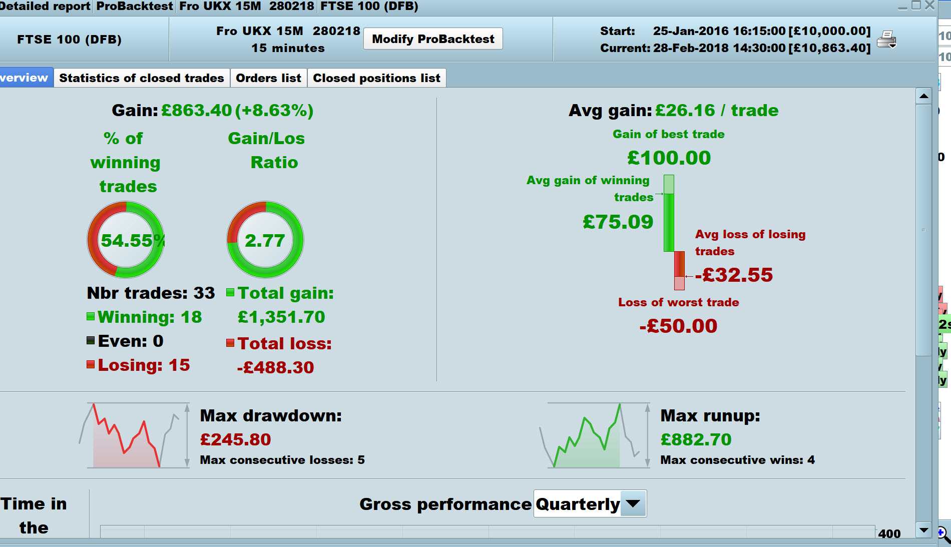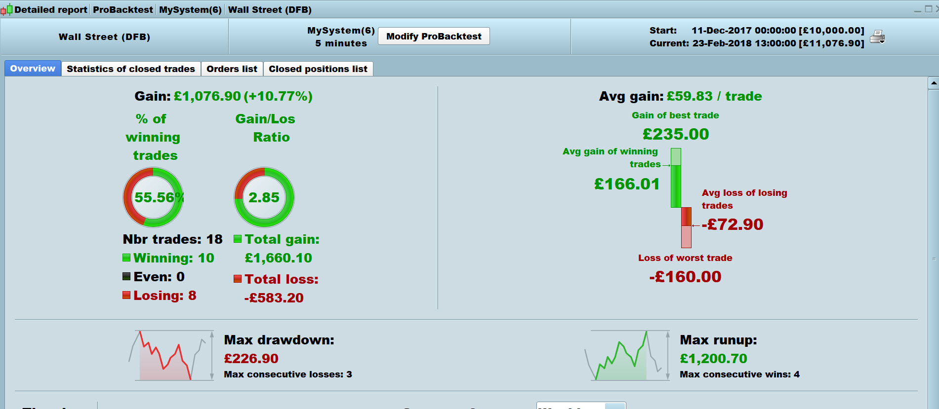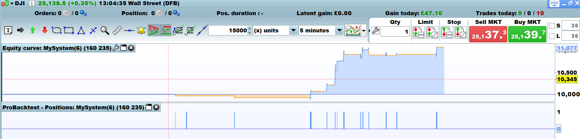 Looks like its got good potential, I got below on the Dow over 10,000 bars at £1 per point spreadbet on 5 Min Timeframe.