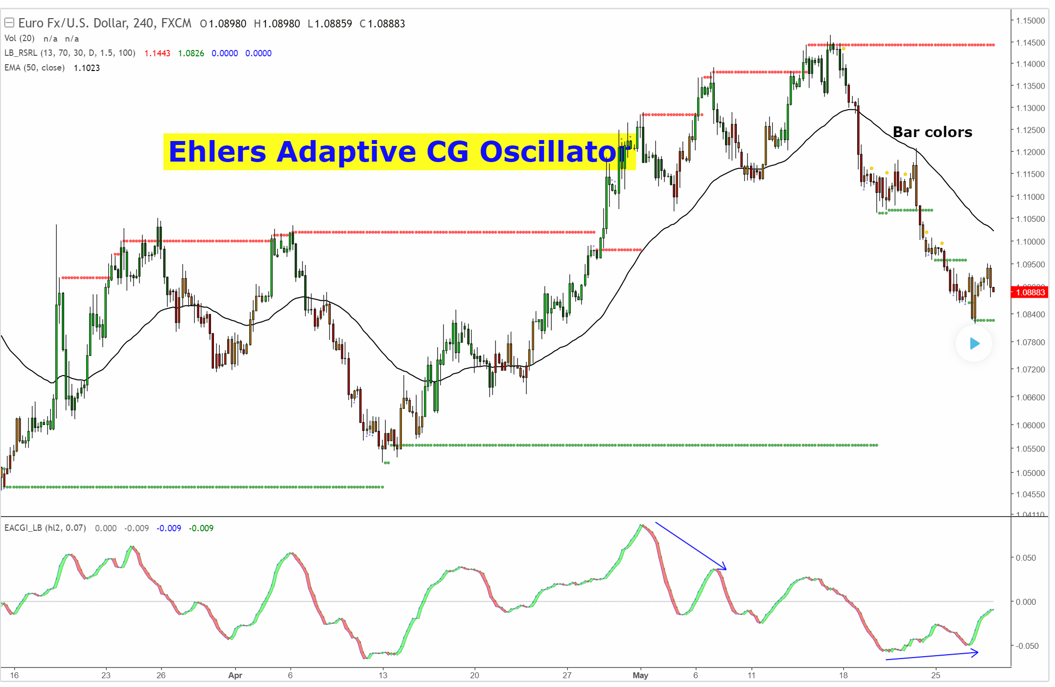 Questa è la versione adattativa del Centro di gravità di Ehlers -1,72% ( CG -1,16% ) (già pubblicato, controlla “Ulteriori informazioni” di seguito). L’idea alla base della creazione di qualcosa di “adattivo” è di calcolarla usando ingressi di periodo di ciclo dinamico invece di impostazioni statiche. Nel CG adattativo-1,16% , Ehlers utilizza il periodo del ciclo dominante come lunghezza nel calcolo dell’alfa.