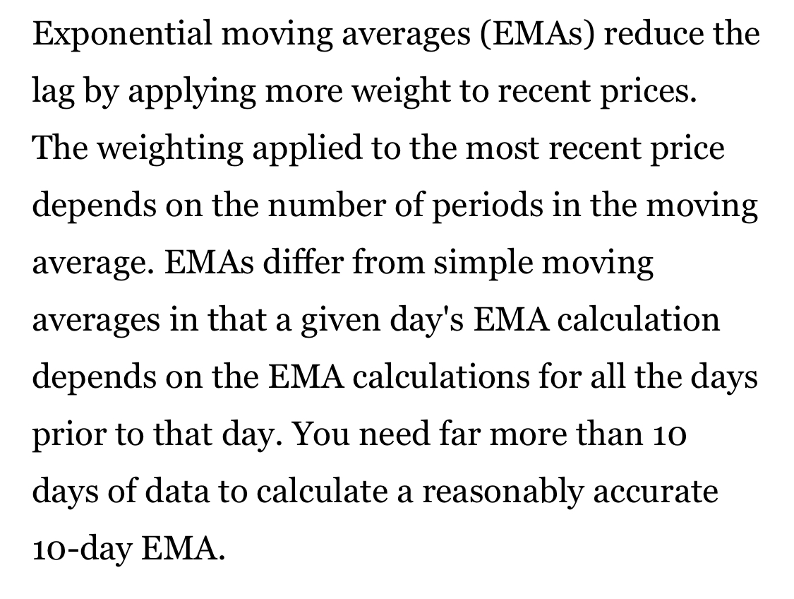 However I dont quite understand your answer when you say “Exponential averages need more than the bars within brackets to calculate correctly.” can you elaborate?